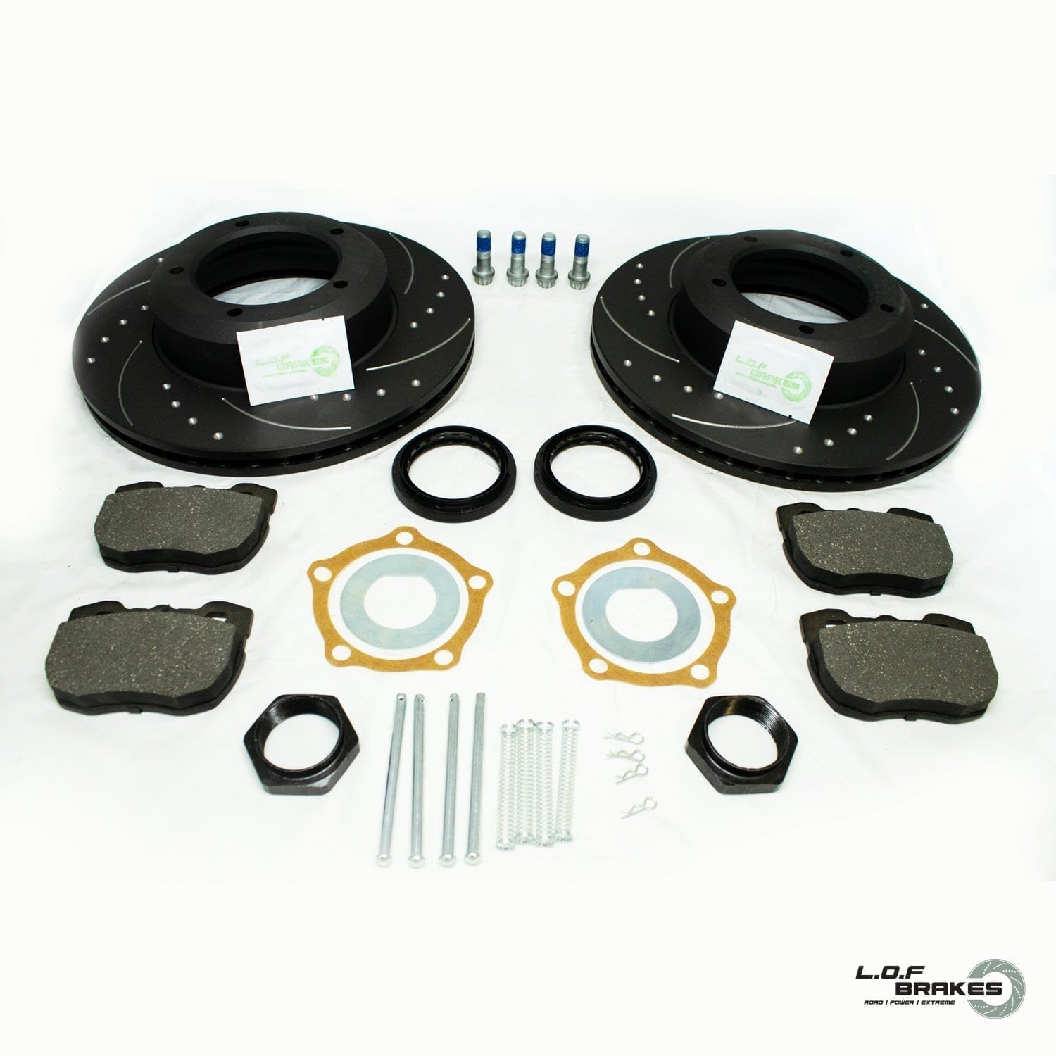 The LOF POWERspec Brake kit is designed for Heavy loaded Land Rovers, Our Discs and Pads are of an ‘OEM’ spec, made to the same Quality and Tolerances as Original Genuine Land Rover brake components. Our POWERspec kits come complete with fitting kit, including fasteners, Pins, anti rattle shims and the correct grease where necessary! Discs: Dimpled and grooved, with black phosphate finish for corrosion resistance and removal of Debris & Heat. Pads: Performance Organic/ Ceramic friction material.